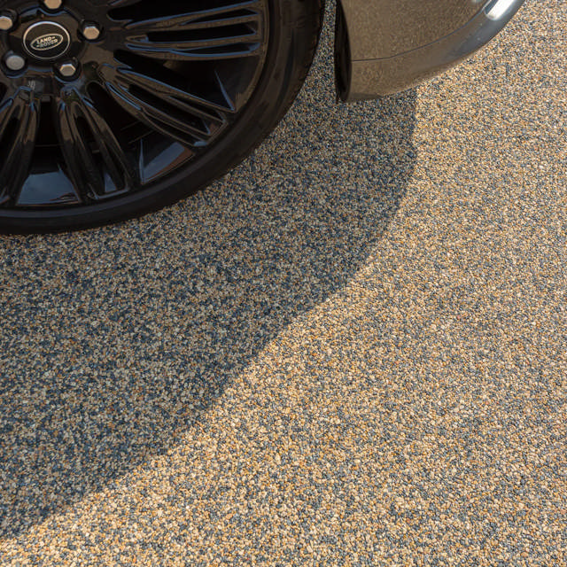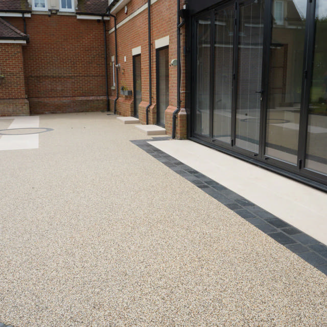 Belægningen består af natursten og harpiks, som danner en fast, jævn og vandgennemtrængelig overflade, der egner sig til både klassiske og moderne ejendomsmiljøer.